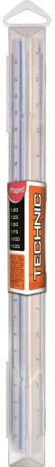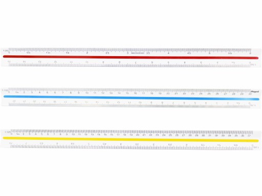 Linijki niezbędne do sporządzania rysunków w zmniejszonej skali. Pakowane w tubę z zawieszka odporną na pęknięcia. Skala 1:20, 1:25, 1:50, 1:75, 1:100, 1:125.