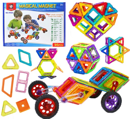 Zestaw zawiera 46 elementów klocków. Wszystkie elementy namagnesowane, z możliwością łączenia się.