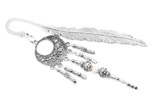 Elegancka zakładka do książki z zawieszką w kształcie łapacza snów z dodatkiem srebrnego hematytu (13 części) i z fasetowanymi, szklanymi koralikami.