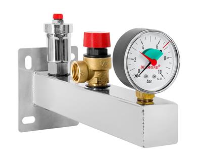 Wysokiej jakości grupy bezpieczeństwa GR.BEZP.CWU.SS do zabezpieczania instalacji ciepłej wody użytkowej przed nadmiernym wzrostem ciśnienia, do pomiaru ciśnienia, oraz do odpowietrzania instalacji.
