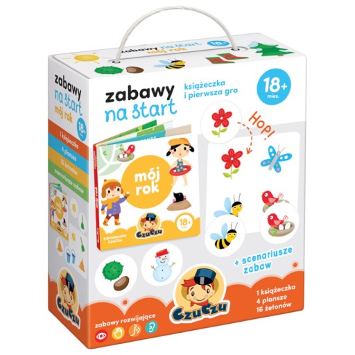 Dzieci dokładnie obserwują świat dookoła siebie, dlatego mądre wykorzystanie zabawy pozwala rozwijać najmłodszym słownictwo i wyobraźnię, a jednocześnie inspirują je do zadawania nowych pytań. Produkt od CzuCzu umożliwia zabawę na wiele sposobów w zależności od chęci i umiejętności najmłodszych. Zestaw zabaw na start zaprojektowany został z myślą o dzieciach przekraczających 18 miesiąc życia. Kompaktowe rozmiary i poręczna forma pozwala na korzystanie z zestawu, gdzie tylko chcesz. Produkt idealnie sprawdzi się w miejscach takich jak poczekalnia czy w długiej podróży. Wewnątrz opakowania znajdziemy, aż 1 książeczkę, 4 plansze i 16 żetonow.