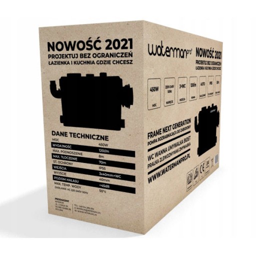Pompa WatermanPro Frame Next Generation została tak zaprojektowana by jej praca była jak najmniej odczuwalna dla otoczenia. Dzięki intensywnej pracy naszych inżynierów uzyskaliśmy stosunkowo niski poziom hałasu w przełożeniu na moc pompy WC. Maksymalnie jest to tylko 45dB! To znacznie mniej niż generuje spłuczka WC.