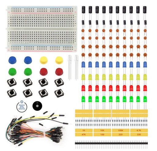 ✅Zestaw startowy najbardziej praktycznych elementów elektronicznych .Dedykowany młodym pasjonatom elektroniki , którzy rozpoczynają przygodę z prototypowaniem, budową obwodów elektronicznych opartych na Arduino, Raspberry Pi oraz innych płytkach rozwojowych.