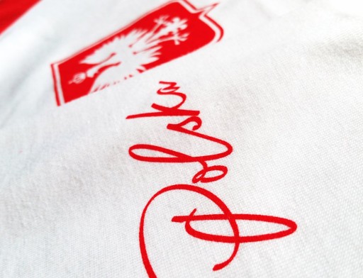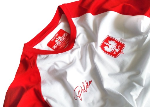 Koszulka wykonana jest w kroju raglan, z kontrastującym, czerwonym materiałem użytym do rękawków i kołnierzyka, który dodatkowo akcentuje symbolicznie wykonane na piersiach: białego orzełka w koronie na czerwonej tarczy, a także nazwę naszego państwa, pisaną niewielkimi literkami, charakterystycznie dobranym rodzajem czcionki. Całość nastawiona jest oczywiście w pierwszej kolejności na nasze barwy narodowe.