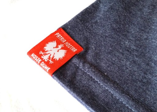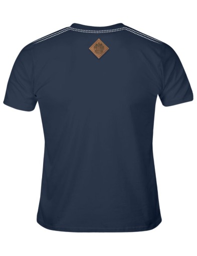 Oprócz naszych stałych dodatków w postaci firmowych żakardów oraz naszywki, koszulkę urozmaicają biała tasiemka wzmacniająca górną część koszulki, obszyta również białą nicią, metodą podwójnego ściegu łańcuszkowego. Koszulkę uzupełnia potnik w kolorze jeansowym.