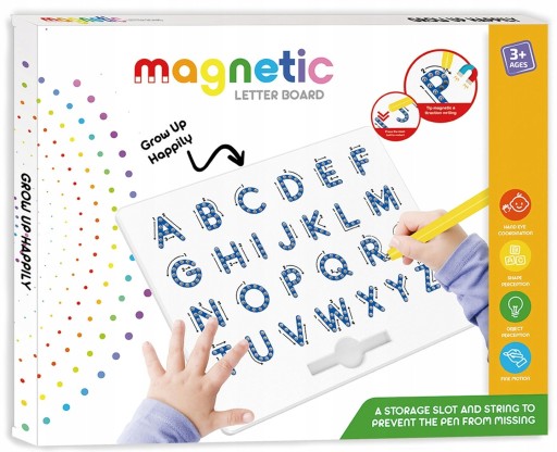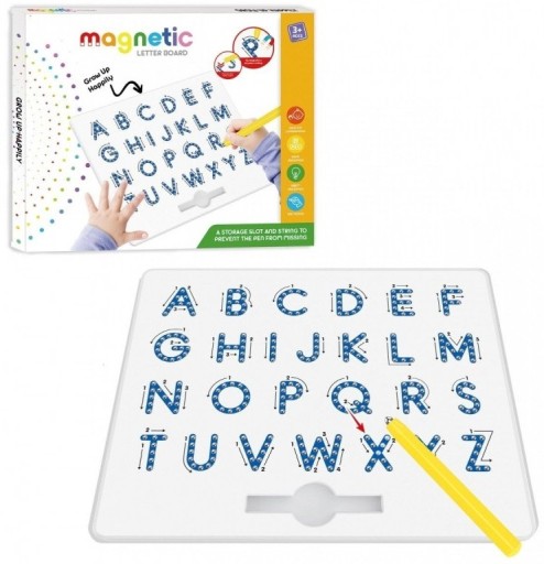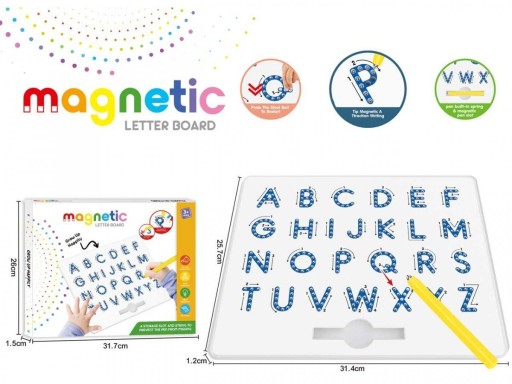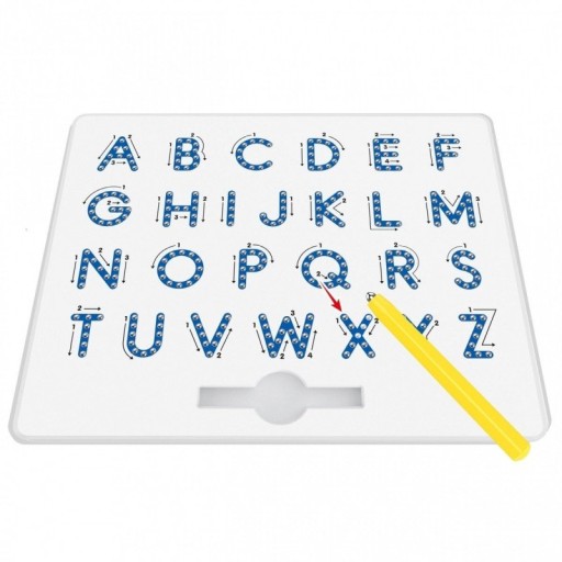 Rewelacyjna zabawka dla dzieci od 3 roku życia. Dzięki tej edukacyjnej tablicy dzieciaki nauczą się liter alfabetu pisząc na specjalnej tablicy przy pomocy metalowych kuleczek. Na tablicy obok literek zaznaczone są ponumerowane strzałeczki, pomogą one wskazując kierunek oraz kolejność zapisu literek.