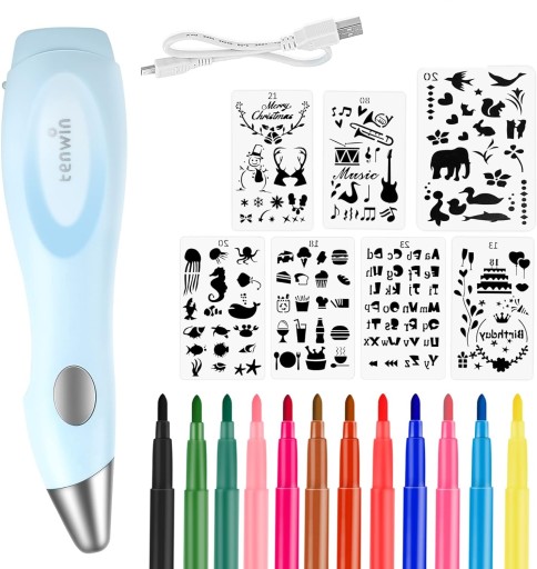Dziecięcy elektryczny pisak w sprayu, zestaw aerografu dla dzieci, z 12 markerami i 7 szablonami 120 pięknych wzorów, aerograf, wesołe kolory, nietoksyczny