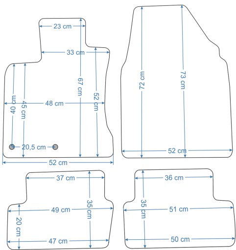 Poniżej wymiary dywaników oraz rodzaj zamontowanych stoperów.