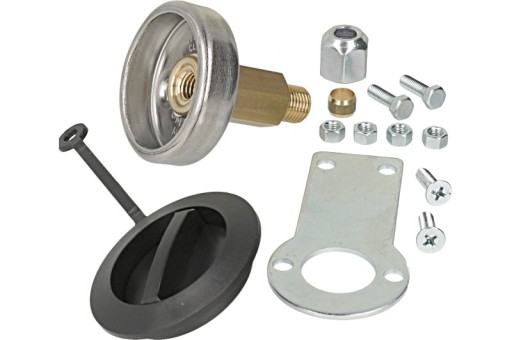 W skład zestawu wchodzi zawór tankowania do zabudowy razem blachą montażową i akcesoriami potrzebnymi do podłączenia przewodu miedzianego.