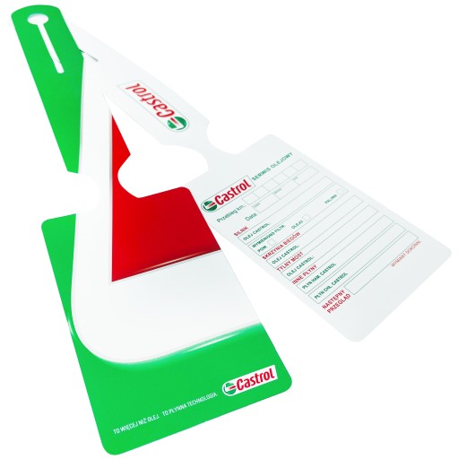 Estetyczny i trwały druk dwustronny w pełnym kolorze, ozdobiony logiem Castrol, nie tylko prezentuje się znakomicie, ale również jest łatwo zauważalny, co pomaga w przypomnieniu o przyszłych przeglądach i wymianach.