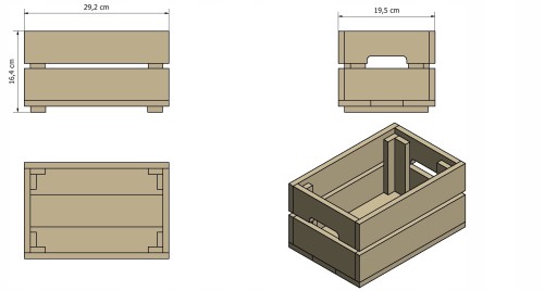 Mała skrzyneczka drewniana z ażurowymi bokami i pełnym dnem. Wyposażona jest w dwa ergonomiczne uchwyty ułatwiające transport.