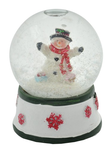 Szklana kula z motywami świątecznymi. Wewnątrz kuli Uśmiechnięty bałwanek z prezentami.