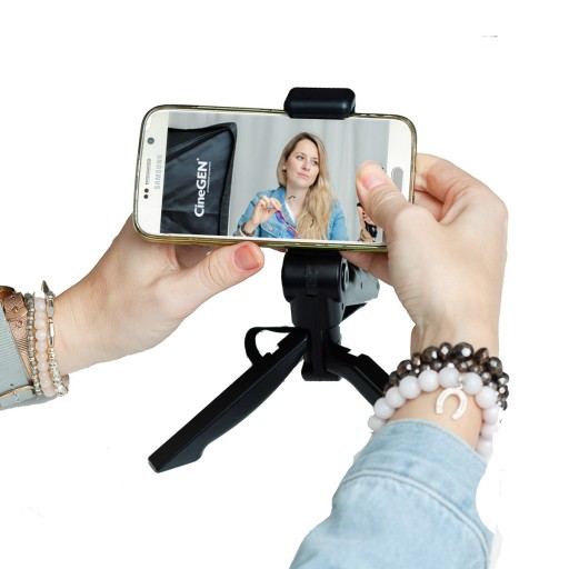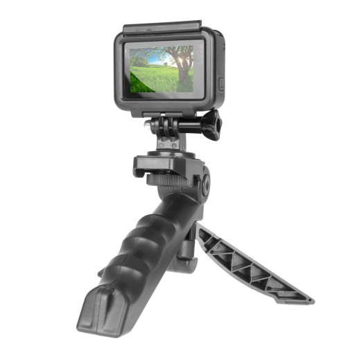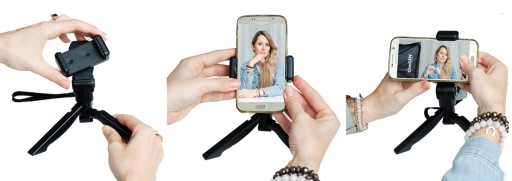 Zestaw akcesoryjny umożliwiający prowadzenie stabilnego ujęcia z ręki (grip) oraz ustabilizowanie kamery na podłożu (statyw).Zestaw umożliwia montaż telefonów komórkowych, kamer, aparatów z gwintem fotograficznym, kamer GoPro®, ActionCam®, oraz telefonów komórkowych. Podstawowe wyposażenie podczas transmisji na żywo w studio, domu czy podróży.