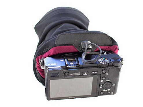 Konstrukcja pokrowca jest wyjątkowo elastyczna przez co założenie go na aparat nie sprawia problemu, idealnie tez dopasowuje się do gabarytów aparatu.