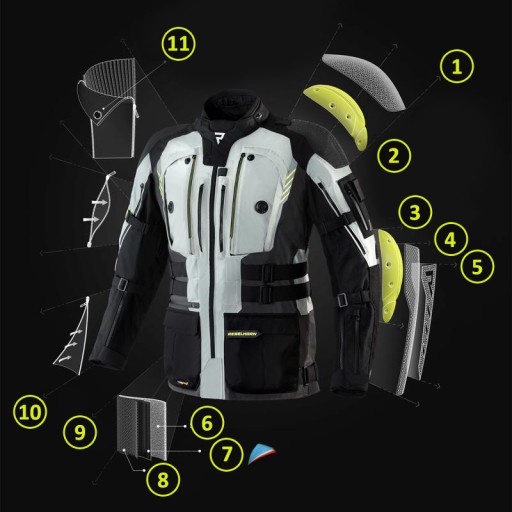 Wysoki poziom bezpieczeństwa to zasługa ochraniaczy CE-level 2 łokci i barków, podwójnych i potrójnych szwów oraz elementów odblaskowych z materiału Reflective®, dzięki którym motocyklista staje się doskonale widoczny po zmroku i w warunkach złej widoczności. Dedykowana kieszeń na plecach umożliwia zastosowanie certyfikowanego protektora pleców (do dokupienia osobno).