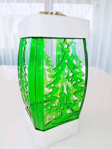 Lampion zrobiony z odpornego na warunki atmosferyczne tworzywa (choinka i boczna obudowa) oraz szkła (wewnątrz 4 szklane tafle chroniące płomień).