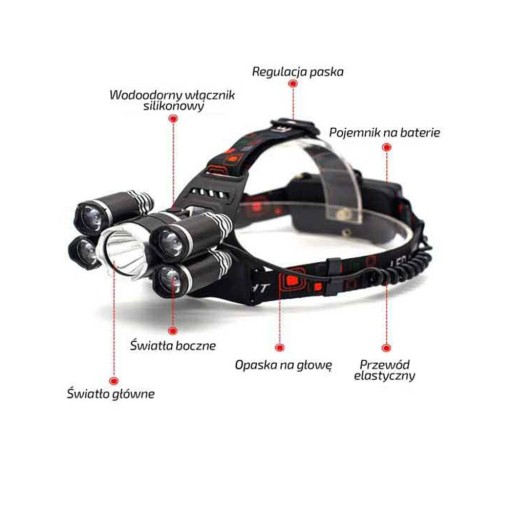 - Latarka czołówka wyposażona w światło główne i cztery światła boczne.