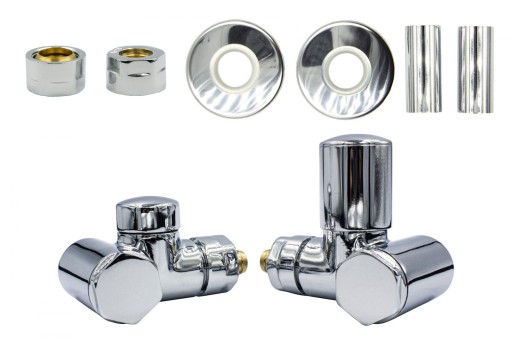 W skład zestawu wchodzą: 1 zawór regulacyjny lewy lub prawy, 1 zawór odcinający lewy lub prawy, 2 rozety maskujące, 2 tuleje maskujące i 2 adaptery/złączki.