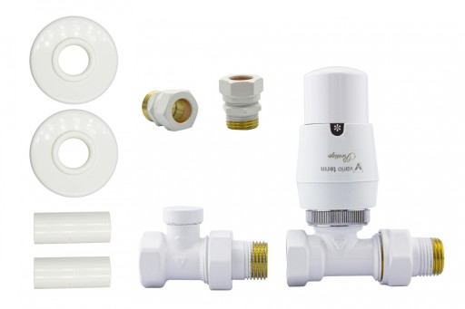 Zestaw instalacyjny „Elegant” prosty - składający się z zaworu z głowicą termostatyczną "Prestige" i zaworu odcinającego w wersji kolorystycznej - biały mat.