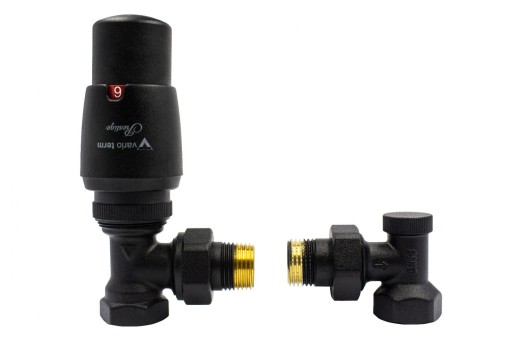 Zestaw instalacyjny „Elegant” kątowy - składający się z zaworu z głowicą termostatyczną "Prestige" i zaworu odcinającego w wersji kolorystycznej - czarny strukturalny.