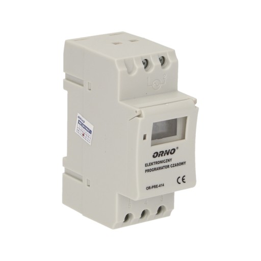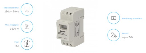 Elektroniczny programator czasowy z wyświetlaczem LCD przystosowany do montażu na standardowej szynie DIN TH-35 mm. Służy do ustawienia czasu włączania i wyłączania urządzeń elektrycznych takich jak: ogrzewacze wody, oświetlenie, silniki, pompy itp. Urządzenie posiada: 16 programów czasowych, ustawienie cyklu dziennego lub tygodniowego, podtrzymanie ustawień zegara w przypadku zaniku prądu.