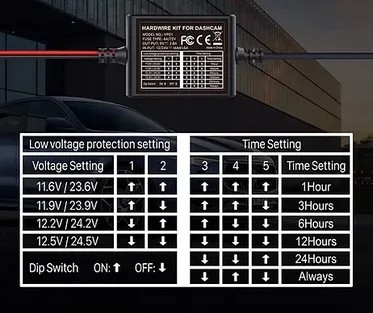 Adapter VANTRUE VP01 współpracuje z instalacjami elektrycznymi 12-24V oraz umożliwia ustawienie jednego czterech poziomów odcięcia zasilania w przypadku spadku napięcia wejściowego z instalacji elektrycznej: