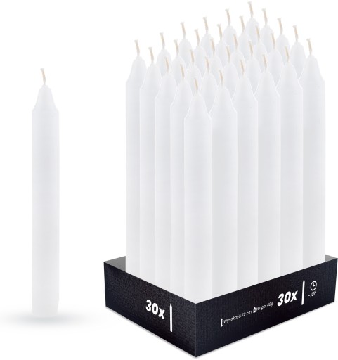 Zestaw 30 białych świec stołowych bezzapachowych. Prezentowane świece stołowe to elegancki akcent, który doskonale sprawdzi się jako dekoracja stołu na wiele okazji. Świece tego typu są ponadczasowym elementem wystroju, który odnajdzie się w każdym wnętrzu. Idealne jako ozdoba blatów, czy stołów na przyjęcia okazjonalne lub jako część stroików. Dostępne w sprzedaży świece to propozycja zarówno do prywatnych wnętrz, hoteli jak i restauracji.