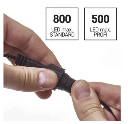 Pozwala na zasilanie 800 lampek LED Standard oraz 500 LED Profi marki Emos łączonych z jednego gniazda zasilającego.
