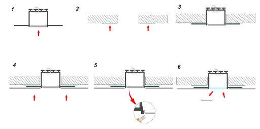 Oprawa montowana na klej montażowy, pomiędzy dwie płyty karton – gips, następnie powinna być osiatkowana i wykańczana gipsem.