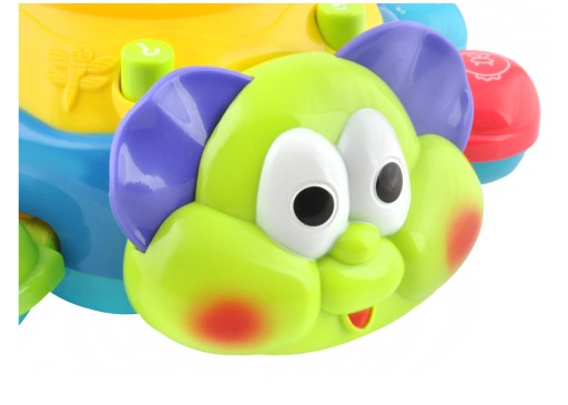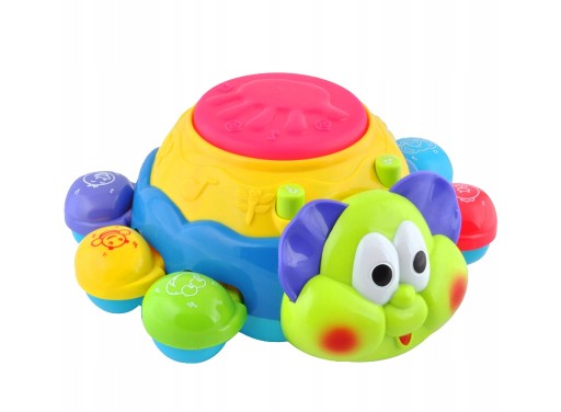 Interaktywna zabawka muzyczna, edukacyjna. Na każdej nóżce zwierzątka znajduje się przycisk odtwarzający w j. angielskim nazwę koloru oraz zwierzątka i jego odgłos wraz z muzyką.