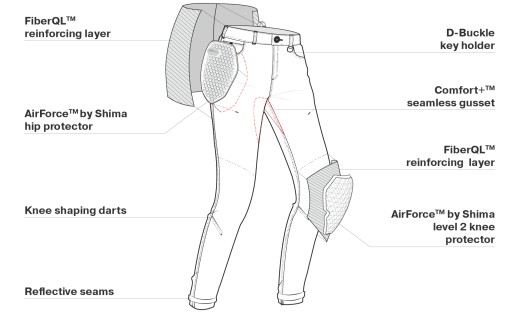 Maksymalna ochrona, duża przewiewność i klasyczny krój. Połączenie tych cech w jeansach motocyklowych DEVON LADY zapewni Ci to, czego potrzebujesz do jazdy na Twoich dwóch kółkach. Obecność wewnętrznej warstwy wzmacniającej wykonanej z FiberQL gwarantuje wysoką odporność na przetarcia oraz przyjemne uczucie lekkiego chłodzenia. Dzięki niej oraz przewiewnym protektorom AirForce (kolana lvl 2, biodra lvl 1) będziesz czuć się naprawdę bezpiecznie. Protektory kolan posiadają 2-stopniową regulację wysokości i ładowane są od środka. Dodatkowo możesz doposażyć się w protektor kości ogonowej SAS-TEC (sprzedawany oddzielnie). Jeansy motocyklowe DEVON LADY posiadają zaszewki modelujące kolano oraz specjalnie zaprojektowany, bezszwowy klin Comfort+ w kroku. Odblaskowe przeszycia na dole nogawki (widoczne po jej podwinięciu) dbają o to, abyś został dostrzeżony na drodze nawet po zmroku. Pętelka łącząca pozwala sparować je z kurtką motocyklową, a w funkcjonalnych kieszeniach możesz przechować dokumenty lub drobne na kawę.
