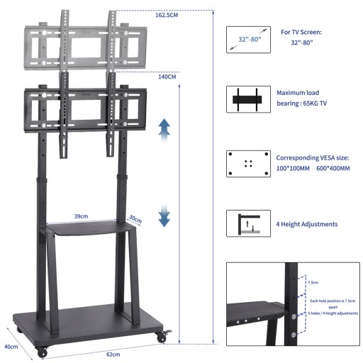 Uniwersalny stojak na telewizor poprawia wrażenia podczas oglądania. Solidna metalowa konstrukcja zapewnia doskonałe bezpieczeństwo i stabilność. Wyposażony w cztery obrotowe kółka, dzięki którym można szybko przemieścić telewizor. Idealnie pasuje do telewizorów o przekątnej ekranu od 32 do 80 cali.