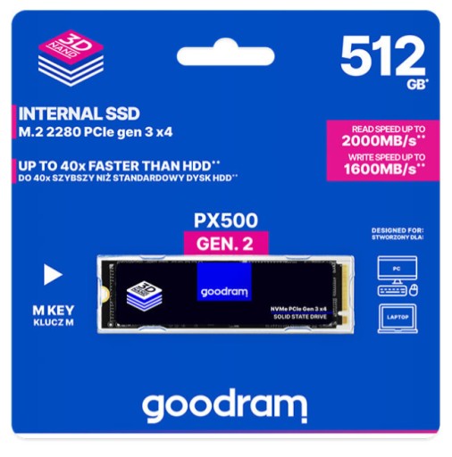 Dostarczając nawet 4x lepszej wydajności transferów sekwencyjnych i losowych w porównaniu do SSD z interfejsem SATA III oraz niższej latencji w porównaniu z dyskami opartymi o standard AHCI, GOODRAM PX500 generacji drugiej znacząco poprawia wydajność komputera. Swoją wydajnością z pewnością usprawni pracę bardziej wymagających klientów, oferując odczyt sięgający 2050MB/s. Doskonale sprawdzi się również jako samodzielny napęd, jak i dodatek do dysku twardego w komputerach stacjonarnych oraz laptopach. Dostępne dla PX500 gen.2 pojemności sprawiają, że w obu rolach PX500 gen.2 będzie czuć się dobrze.