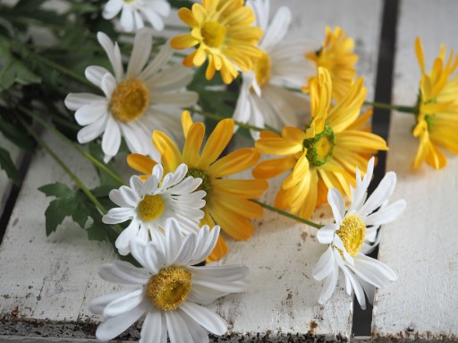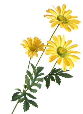 Okazała gałązka rumianku z trzema kwiatami i zielonymi listkami. Wygląda bardzo naturlanie, do złudzenia przypomina prawdziwe kwiaty.