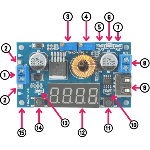 ⚠️ UWAGA! Napięcie w gnieździe USB jest takie same jak ustawione napięcie wyjściowe. Pamiętaj, aby ustawić napięcie 5 V na wyjściu przetwornicy, zanim podłączysz USB ‼