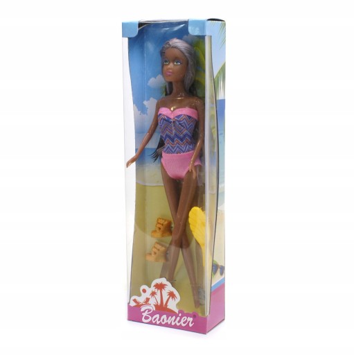 Klasyczna lalka z długimi włosami, ubrana w śliczny strój plażowy.