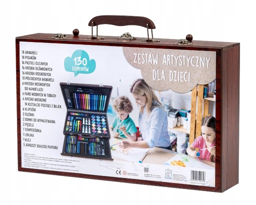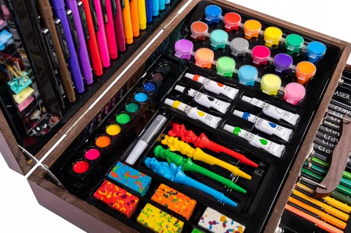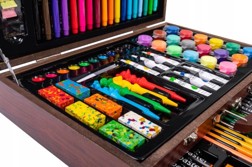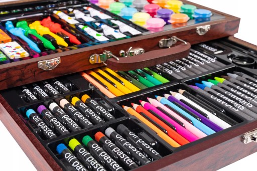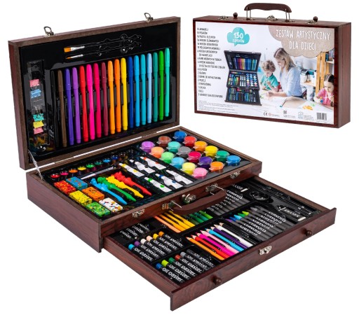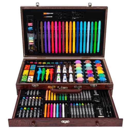 Zaskocz swoje dziecko tym wspaniałym zestawem, który z pewnością jest marzeniem każdego chłopca i dziewczynki lubiących rysować czy malować! Twoje dziecko będzie mogło tworzyć piękne obrazy i rysunki. Cały zestaw schowany jest w stylowej drewnianej walizce. Dzięki walizce każdy element ma swoje miejsce co pozwala zachować porządek przez cały czas użytkowania.