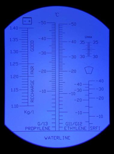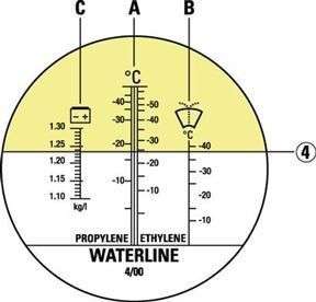 • A - - skala temperatury zamarzania płynu chłodniczego wyskalowana w°C w zakresie od 0 do - 50°C z dokładnością 5°C. Posiada dwie skale z lewej dla płynów opartych na propylenie oraz z prawej strony dla płynów opartych na etylenie głównie stosowanych w Europie.