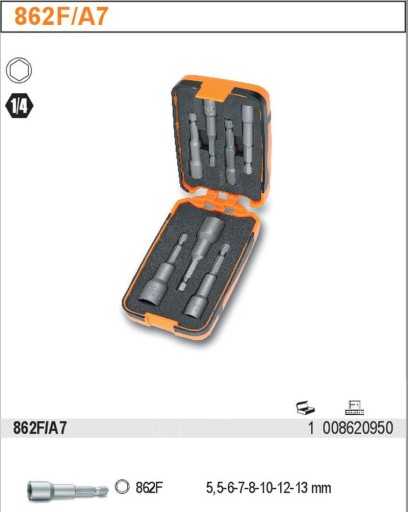 Komplet końcówek wkrętakowych magnetycznych z nasadką sześciokątną 862F/A7 5,5 - 13mm - 7 sztuk w pudełku z tworzywa sztucznego BETA 862F/A7