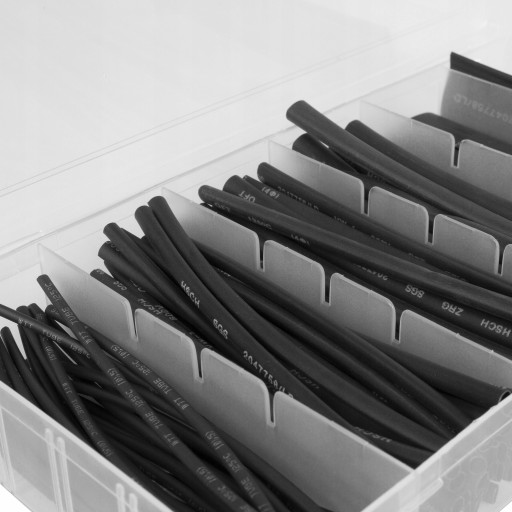 W praktycznym, solidnym opakowaniu z tworzywa sztucznego znajduje się 100 sztuk rurek termokurczliwych w kolorze czarnym. Długość pojedynczej rurki wynosi 10cm. Poniżej prezentujemy poszczególne elementy tego zestawu: