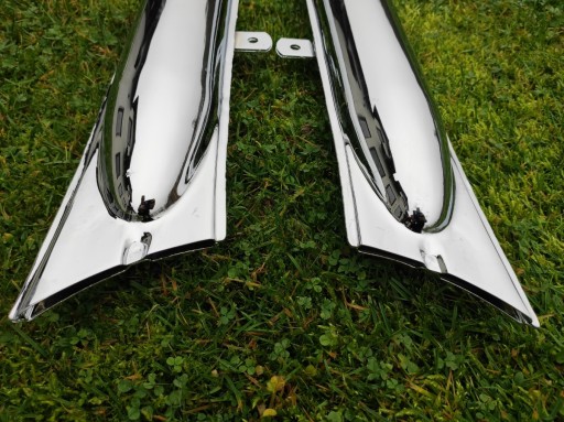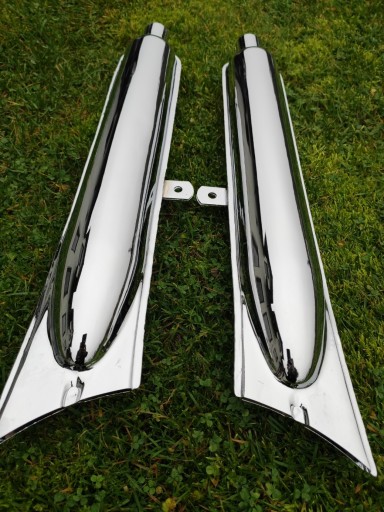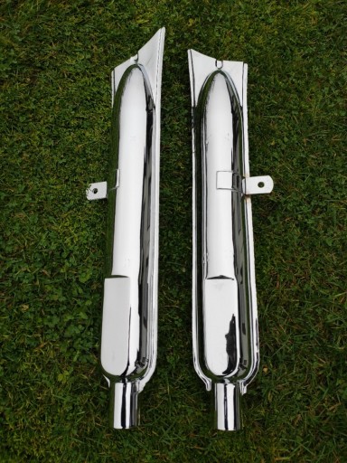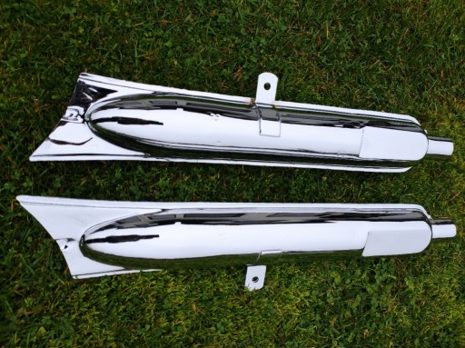 Fabrycznie nowe tłumiki typu "rybki" z mocowaniem, chromowane do radzieckich bokserów.