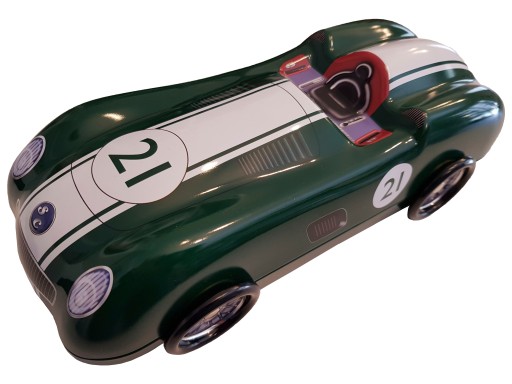 Samochód wyścigowy/Pojemnik/Puszka z Angielskiej kolekcji w stylu RETRO. Wykonana z wysokiej jakości blachy. Pokryta emalią. Nadaje się do żywności! Koła się obracają!