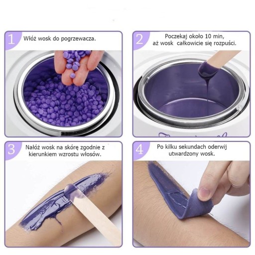 Przygotowany wosk należy nałożyć drewnianą szpatułką (dostępną również na naszych aukcjach) na dedykowaną powierzchnię ciała. Warstwa wosku powinna szczelnie pokryć skórę z owłosieniem. Nie należy spieszyć się podczas aplikacji wosku i dokładnie docisnąć szpatułką wosk.