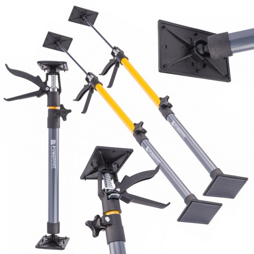 Podpora znajdzie swoje zastosowanie podczas montażu płyt sufitowych / ściennych (kartonowo-gipsowych) pod niewygodnym kątem lub przy naprawianiu powierzchni klejonych. Funkcja teleskopowa umożliwia regulację wysokości, a uchylne płyty dociskowe zapewniają stabilne zamocowanie.