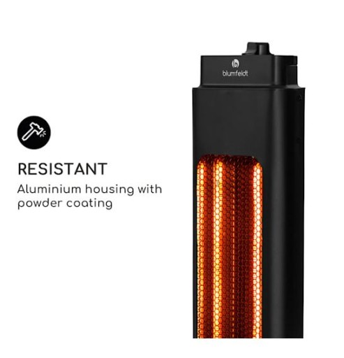 Grzejnik na podczerwień ze stopniem ochrony IP65 zabezpiecza przed pyłem i strumieniami wody, a także doskonale nadaje się do użytkowania na zewnątrz. Zadbano również o bezpieczeństwo: duża podstawa zapewnia przyczepność i maksymalną stabilność przez cały czas.
