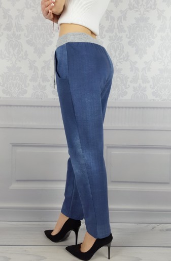 Materiał jest elastyczny i poddaje się kilka cm dopasowując się do sylwetki. Spodnie naciągają się w pasie około 8 - 10cm. biodra około 10 cm.
