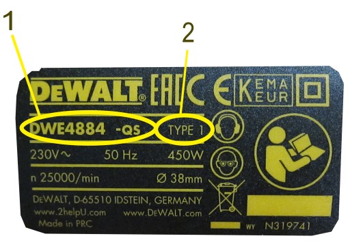 Należy odszukać na narzędziu tabliczkę znamionową taką jak na przykładowym zdjęciu. Numer 1 oznacza model elektronarzędzia, natomiast 2 jego TYP.