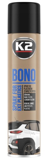 K2 BONO to prosty w użyciu środek do odnowienia plastików zewnętrznych. Wysoce skuteczny w wydobywaniu oryginalnego koloru, odnawia i zabezpiecza wszelkie powierzchnie plastikowe, winylowe oraz gumowe. Przywraca głębie plastikowym listwom, zderzakom czy osłoną nadkoli i sprawia, że wyglądają jak nowe.Dodatkowo K2 BONO zabezpiecza pokryte elementy przed blaknięciem, pękaniem i działaniem czynników atmosferycznych jak promieniowanie UV. Dzięki łatwej aplikacji oraz bezpiecznej formule wystarczy nanieść K2 BONO na plastiki, odczekać chwilę i zetrzeć suchą mikrofibrą. Efekt odnowienia gwarantowany.