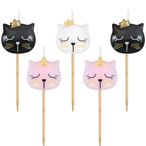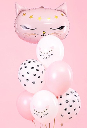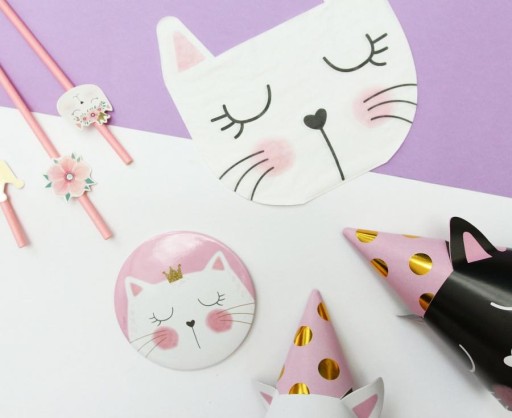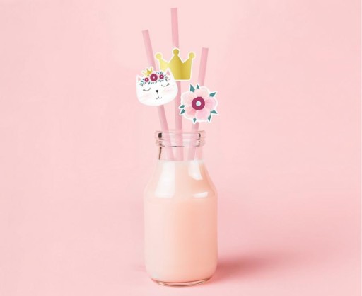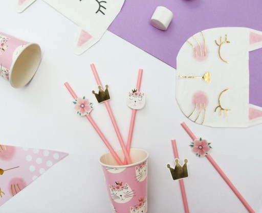 - Słomki w kolorystyce jasno-różowej ozdobione kwiatuszkami, koroną oraz główką kotka.