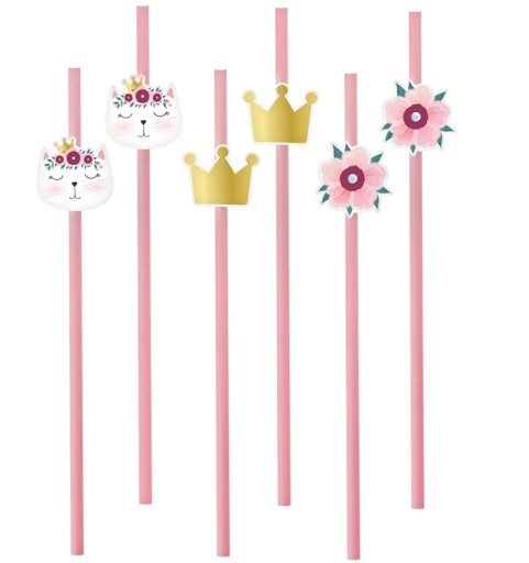 Świetny zestaw 6 słomek z kolekcji Kotek ozdobionych kwiatuszkami, koroną oraz główką kotka.